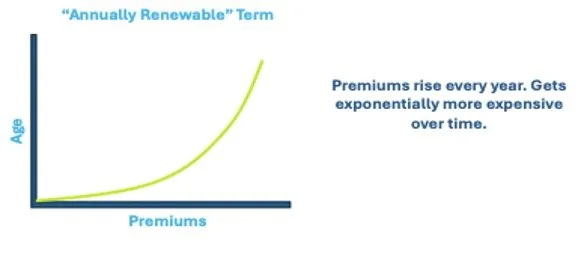 There are two main types of term life coverage. “Annually renewable” term is coverage that starts at a low rate when you’re young and gets more expensive every year. As you age, it gets exponentially more expensive. We do not recommend this kind of coverage for doctors. See the graph below: